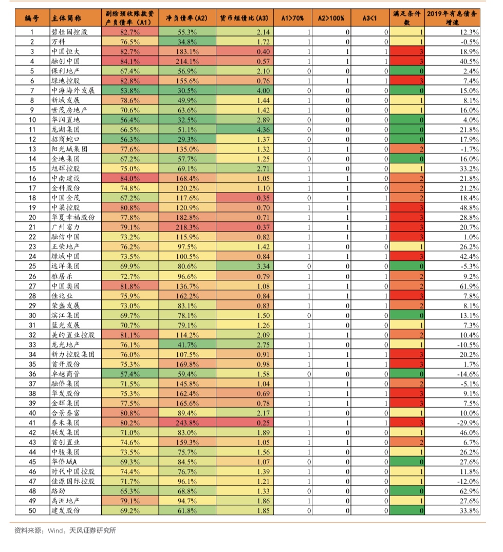 天风证券根据2019年财务数据,按照剔除预收账款资产负债率为70%、净负债率为100%、货币短债比为1三条标准对销售额较高的50家房企进行了划分。
