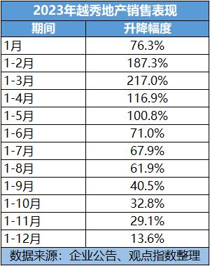 全年的高增长也受到影响,2023年前3个月越秀地产录得销售增幅217%,半年度时候为71%,到9月末增幅降至40.5%,最新增幅下滑到13.6%。