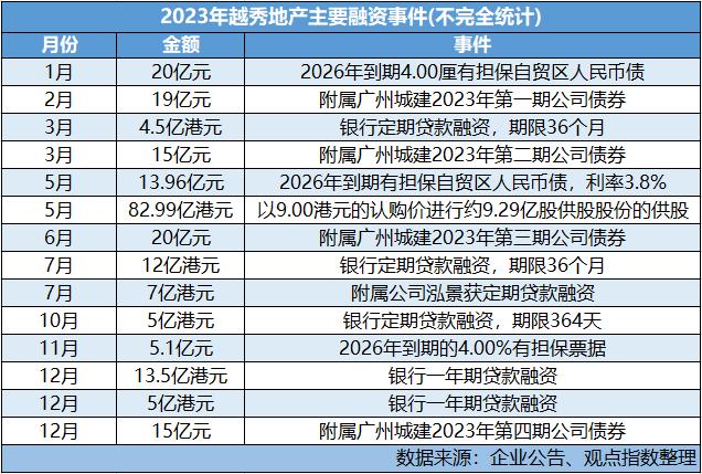下半年以来,越秀地产于7月通过附属公司泓景获7亿港元定期贷款融资;同月再获一家银行12亿港元定期融资,期限为36个月;9月获授6亿港元定期贷款融资;10月获5亿港元定期贷款融资,期限364天。