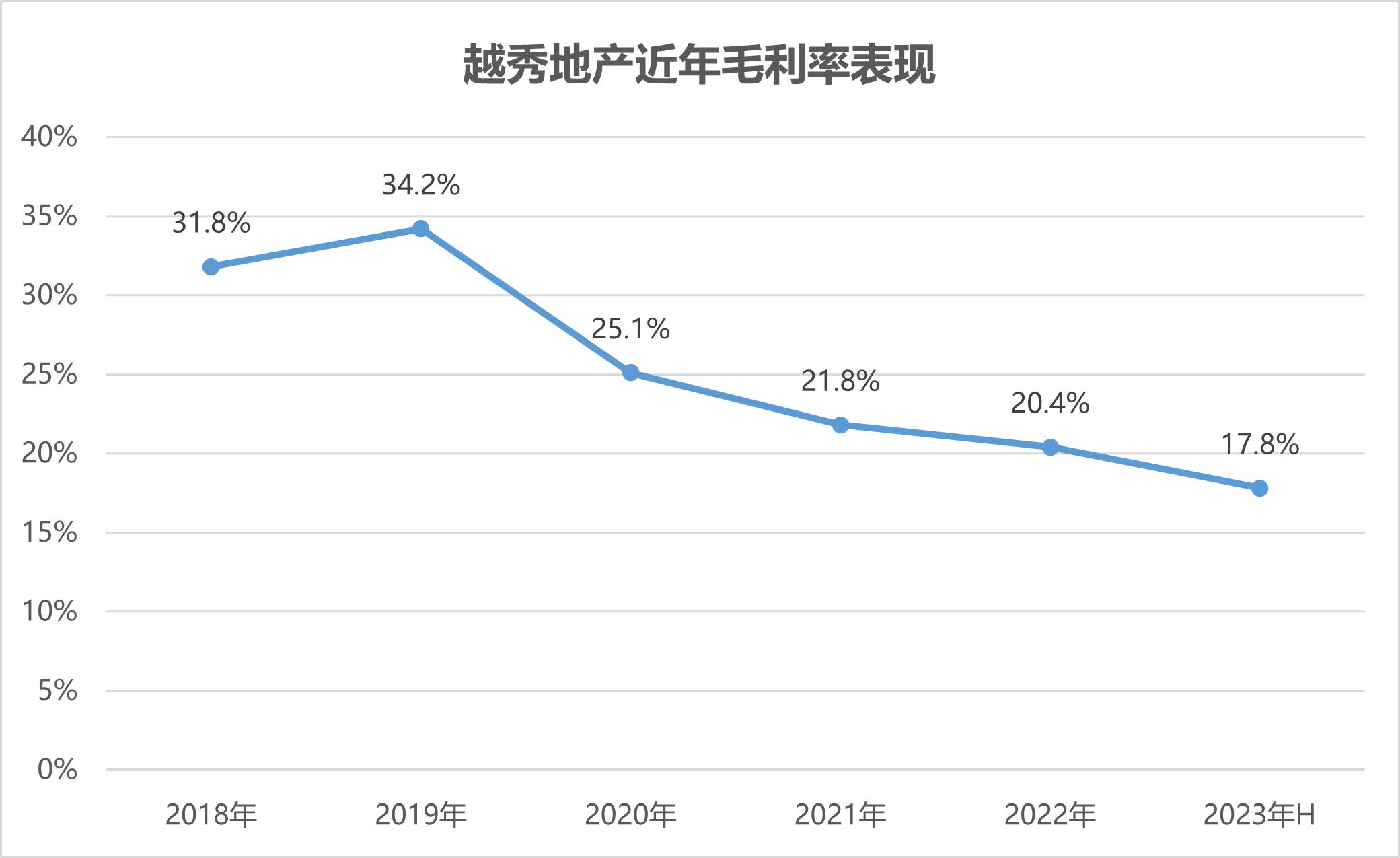 反映到利润端,据2023年半年报,越秀地产毛利润为57亿元,同比降低14.2%。毛利率为17.8%,首次下降至20%以下。
