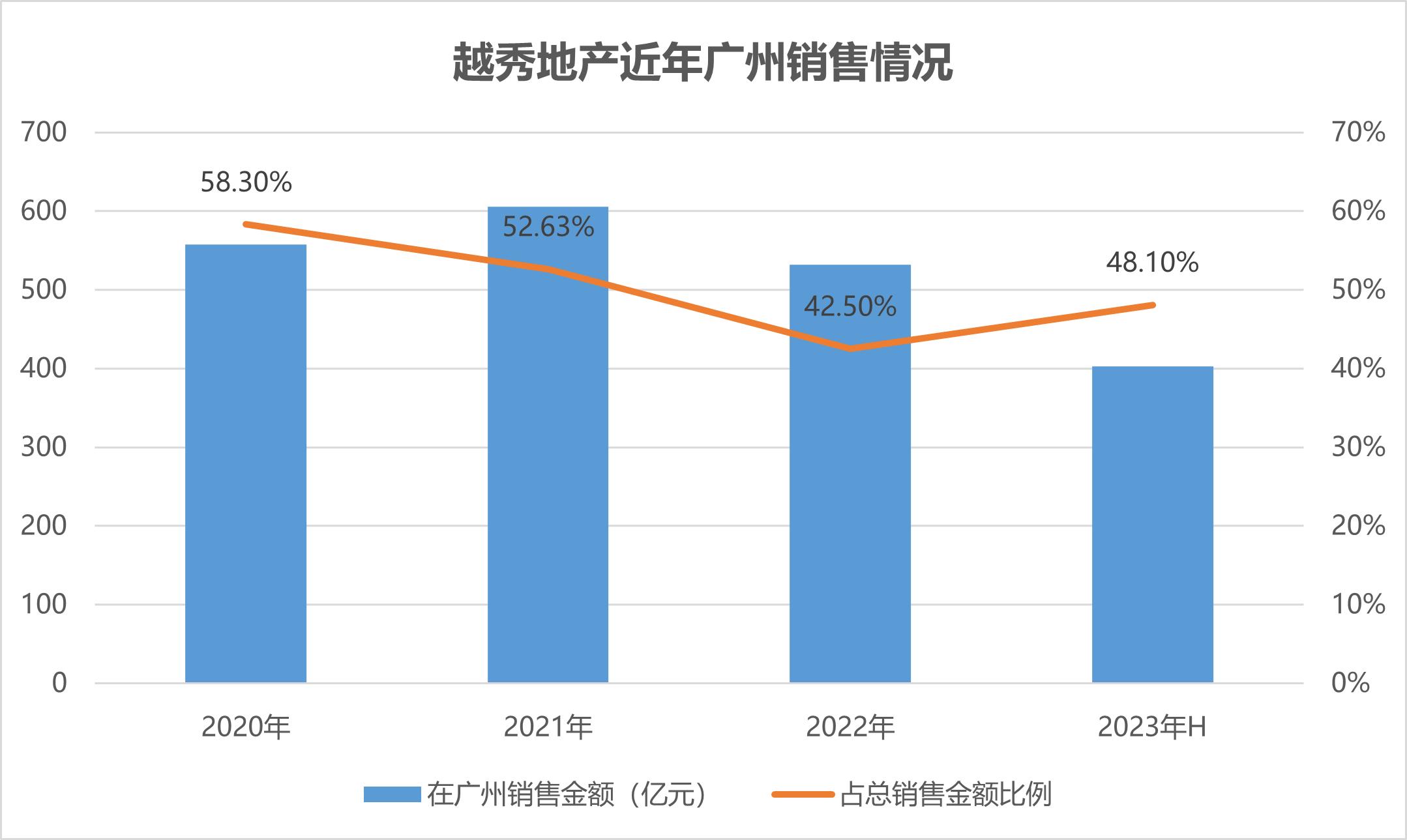 从销售资料上看,越秀地产2021年在广州区域实现的合同销售额606亿元,同比增长8.6%,占全部销售额约52.63%;2022年资料为销售金额531.9亿元,占比42.5%;2023年上半年,越秀地产在广州实现销售402.6亿元,占比达48.1%。