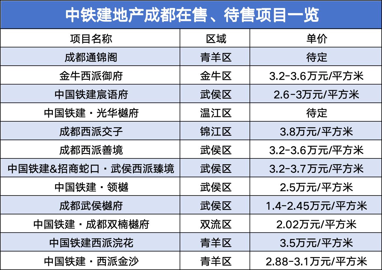 观点新媒体查阅铁建好房小程序发现,截至目前,中铁建地产在成都在售、待售项目共计12个,包括成都西派善境、中国铁建·西派金沙、金牛西派御府等项目。