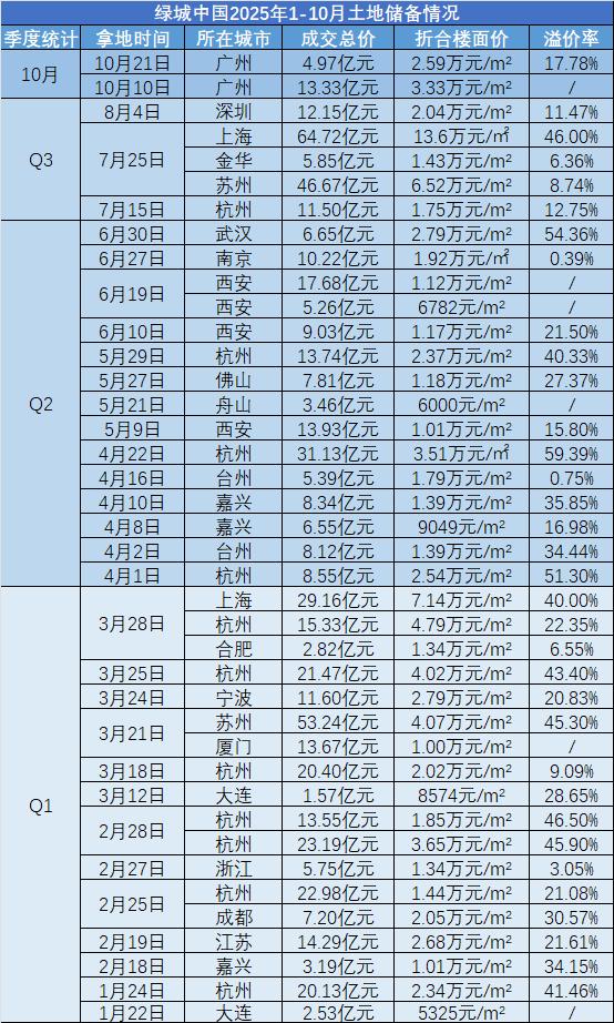 据观点新媒体不完全统计,1-10月,绿城中国今年已累计拿下40块地,其中仅有6幅地块为底价成交,其余34幅均溢价成交。