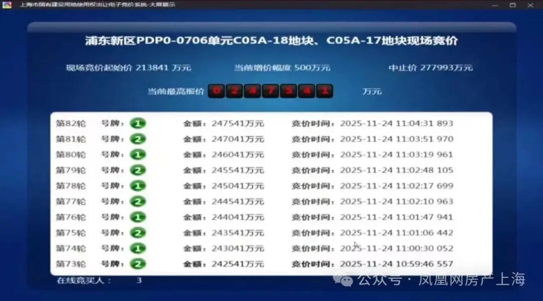 上午,浦东川沙地块正式开拍,佳运置业董事长沈仁兴亲自到场坐镇。这份“一把手”级别的重视,已为这场土拍的激烈程度埋下伏笔。据悉,该地块自挂牌以来便保持较高热度,最终吸引陆家嘴、象屿&湖北清能三家实力企业参与竞逐,一场长达82轮的竞价拉锯战由此展开。