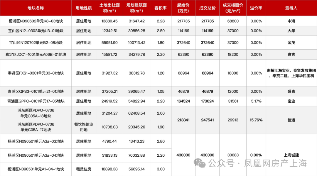 值得注意的是,今日上海土拍并非佳运、宝业两家独美,中海、金茂、大华、上海城建等多家房企均有所斩获,且多数地块以底价成交。