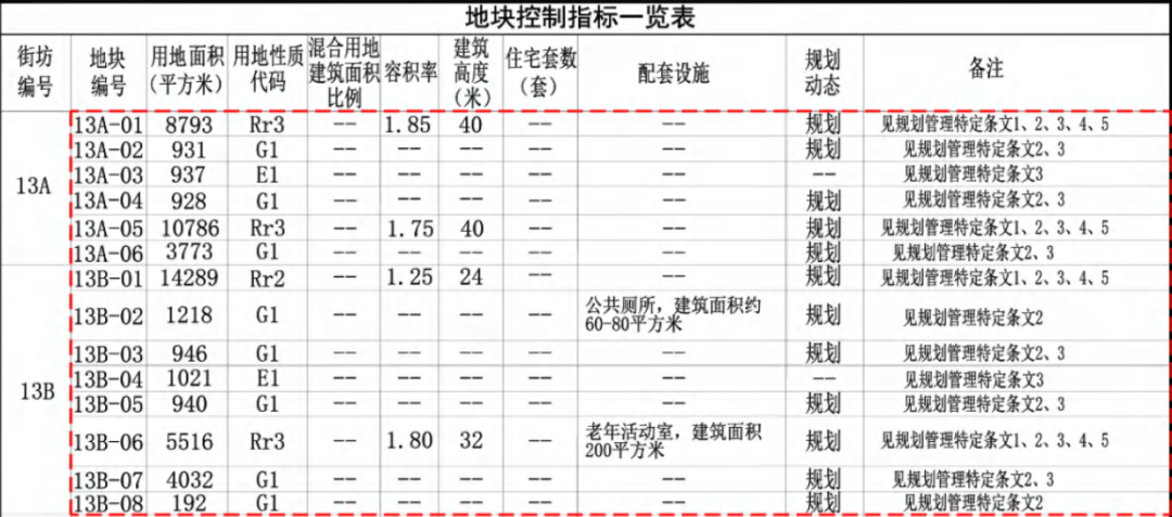 本次规划调整主要涉及多项用地指标与用地性质的更新。具体包括:取消13A-01、13A-05、13B-01、13B-06地块的“安置房”备注;同步对容积率、用地性质及建筑高度作出如下调整: