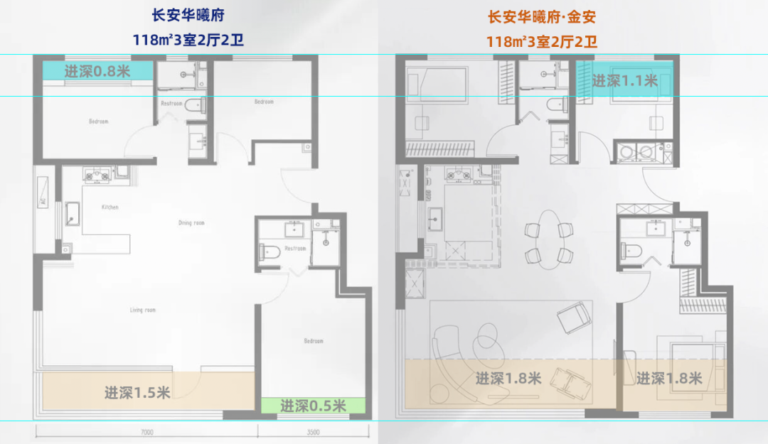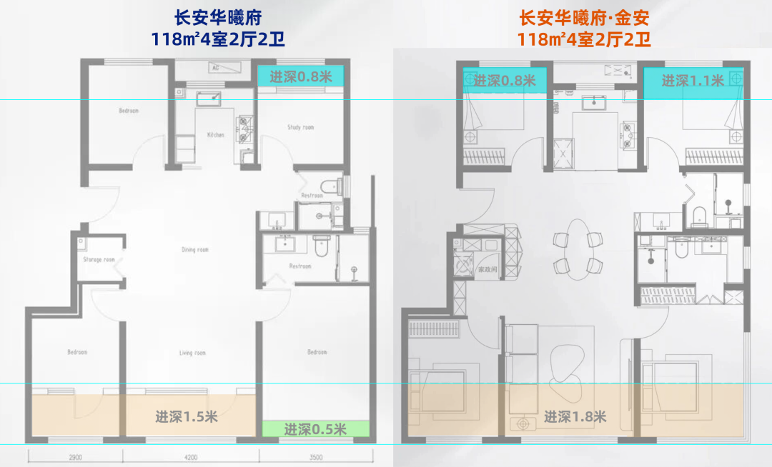 首先,一期的南阳台是客厅和次卧,进深1.5米;二期直接升级成通面宽,南向三个开间全部赠送1.8米进深的阳台;