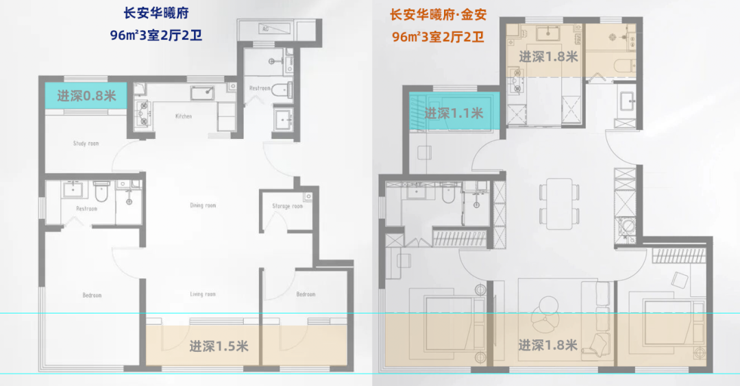 南向阳台进深由1.5米加大到1.8米;北向设备平台进深则由0.8米扩大到1.1米。另外,还有L型飘窗全赠送。