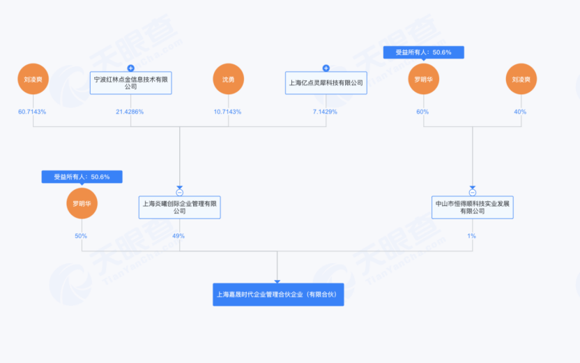 根据详式权益变动报告书,这家注册资本2亿元的合伙企业由三方出资构成:罗明华直接持股50%,刘凌爽通过控股60.71%的上海炎曦创际持股49%,剩余1%由二人共同控制的中山市恒得顺科技持有,而恒得顺正是嘉晟时代的执行事务合伙人。
