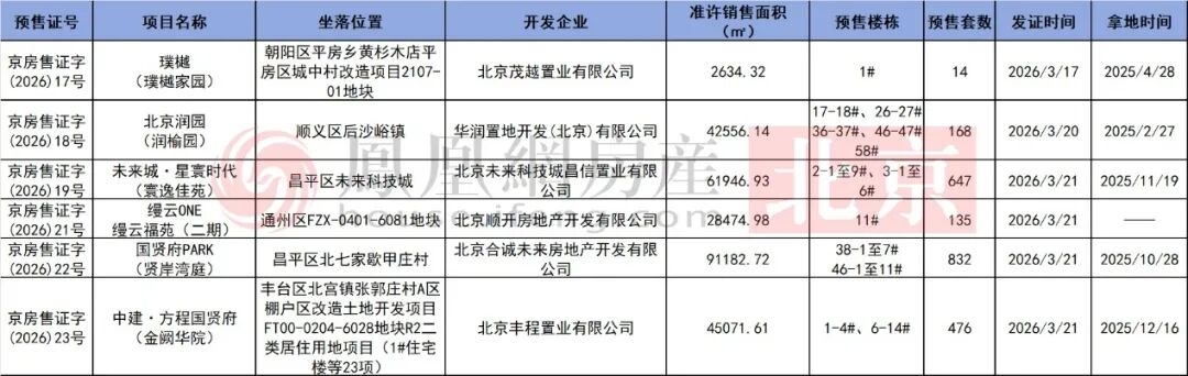 3月16日至3月22日,北京6盘获取预售证,包括璞樾、北京润园、未来城·星寰时代、缦云ONE、国贤府PARK以及中建·方程国贤府,共涉及2272套房源,准许销售面积27.19万㎡。