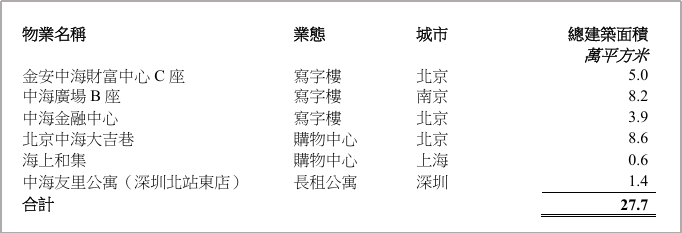 2025年,中海实现六个商业项目新投入运营,商业物业运营总建筑面积增加近28万平方米。