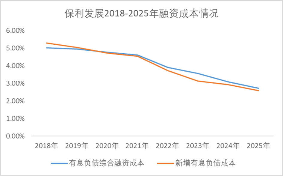 数据显示,2018年至2025年间,保利发展新增有息负债成本及综合融资成本均在逐渐下降;自2020年起,新增部分成本便低于综合成本,说明在资本市场上愈发受到信任。