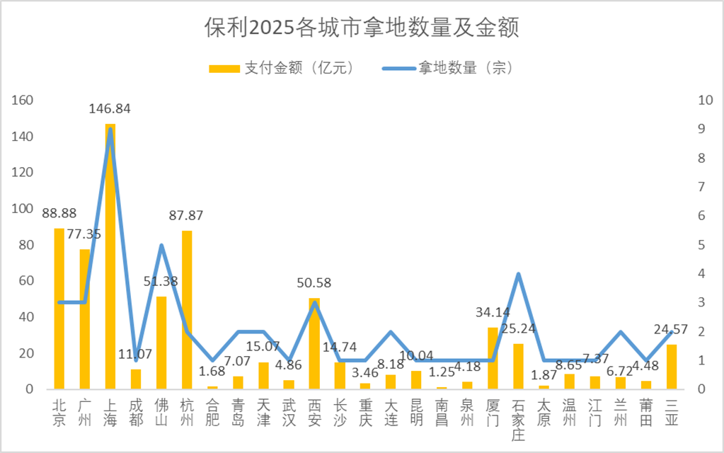 按城市能级划分,保利发展2025年内在一二线城市投资占比超过了90%。其中,一线城市投资占比约44.9%,杭州、佛山、西安等新一线城市占比35.5%,厦门、石家庄等二线城市占比13.4%。