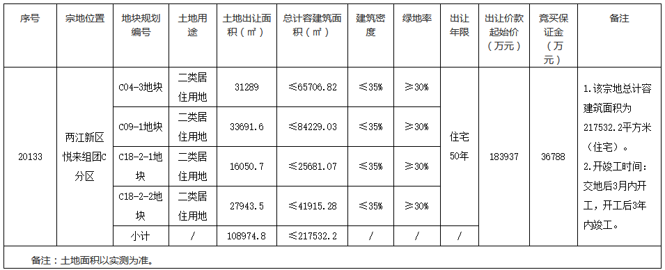 资料显示,该地块序号为20133,位于两江新区悦来组团C分区。出让面积108974.8㎡,起始价183937万元,竞买保证金36788万元,建筑密度≤35%,绿地率≥30%。