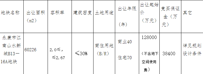 地块编号2021-03,地块名称为永康市江南山水新城B13-16A地块,出让面积6.02万平,土地用途为商住用地,容积率2.67,建筑面积16.08万平,起始价12.8亿元。