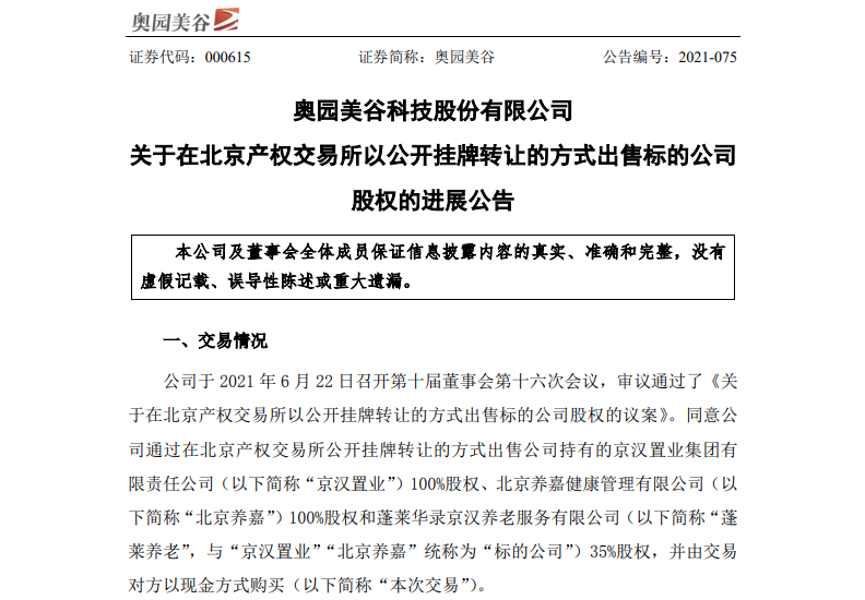 7月15日,奥园美谷发布公告表示,公司在北京产权交易所公开挂牌转让出售的10.2亿地产业务资产包已获成交。