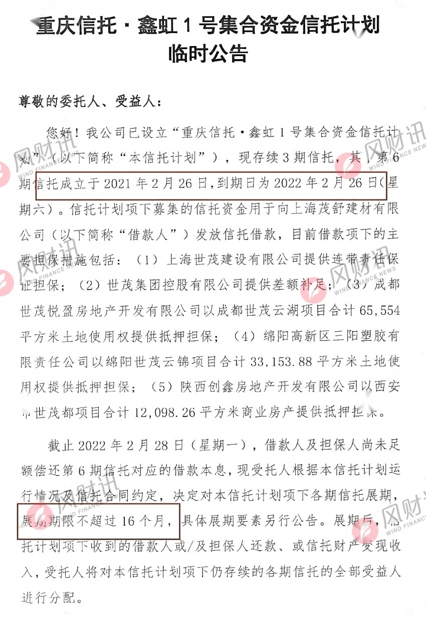 (原标题:重庆信托公告:世茂担保的一笔信托展期16个月)