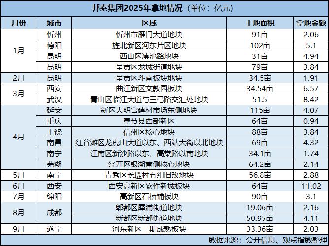 不过,邦泰今年拿地高峰主要集中在1月至4月,拿地数量为13宗,5月至今仅零星在南宁、西安、绵阳、成都及遂宁拿下6宗地块。