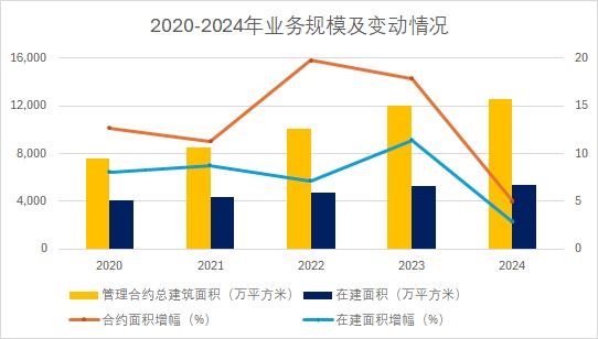 2020年至2024年,绿城管理代建项目的管理合约总建筑面积分别为7610万平方米、8470万平方米、1.01亿平方米、1.20亿平方米、1.26亿平方米,增幅分别为12.7%、11.3%、19.8%、17.9%、5.0%。