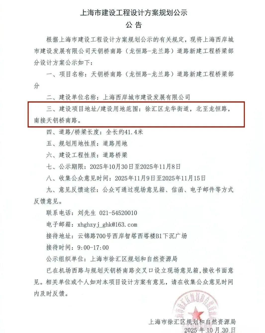 原来,徐汇区规划和自然资源局发布了《关于天钥桥南路新建道路中桥梁部分的设计方案》,正式向公众征集意见。