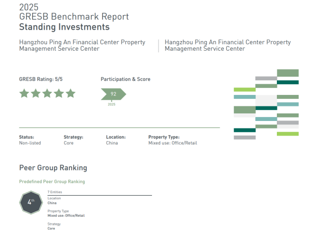 “GRESB”全称为全球不动产可持续发展评级体系,是全球房地产及基础设施领域的最高评级体系之一,2024年,深圳平安金融中心、北京丽泽平安金融中心,也曾获评GRESB 年度五星评级。