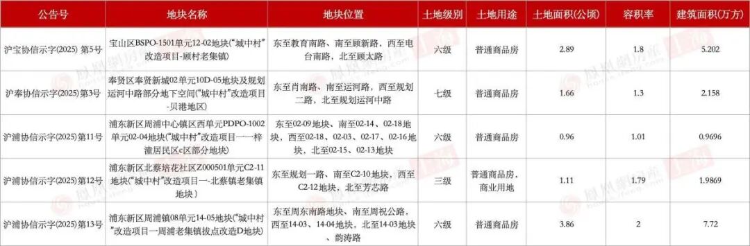 近日,上海市规划和自然资源局发布5宗土地协议出让公示,分别位于宝山区、奉贤区及浦东新区。5宗地块均为“城中村”改造项目,总土地面积约10.48公顷,总建筑面积约18万平方米。