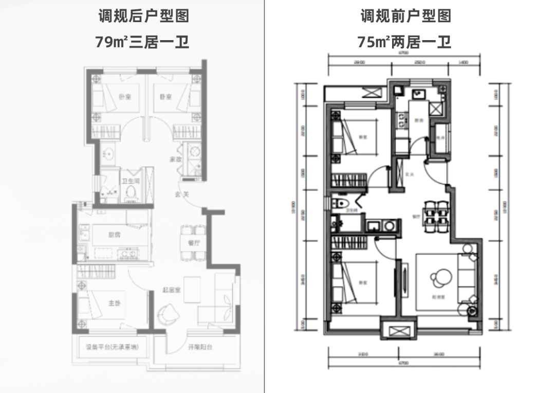 现在79㎡户型变身为三居,餐厅对着厨房,还有了家政间。