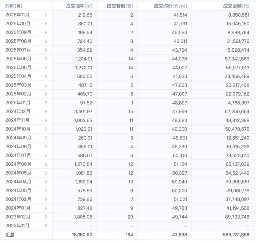 它最高光的时刻,甚至成交均价突破5.1万/㎡,但近两个月成交均价降至4.1万/㎡左右。