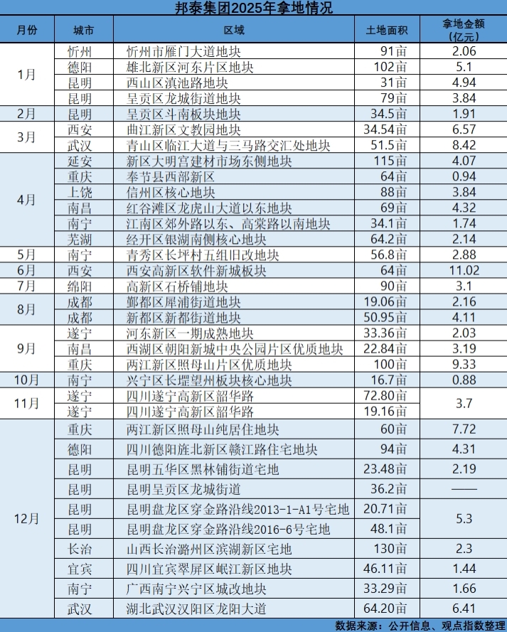 据观点指数统计,邦泰2025年累计拿地投资金额超120亿元。