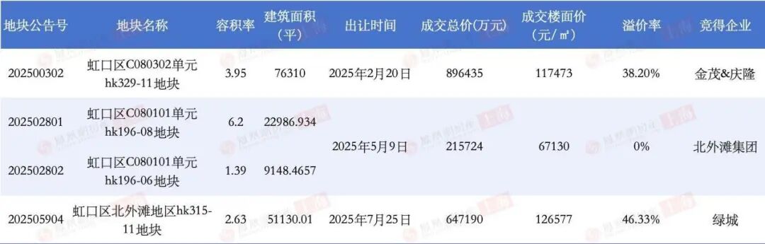 回顾2025年上海土地市场,虹口区虽出让宗数不多,但热度与含金量持续高企,全年成交的3宗涉宅用地总金额达175.9亿元,位列全市第二。