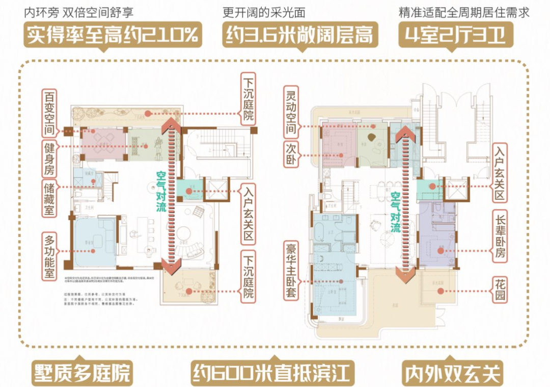以“近乎全两层+会所”的形态、花园露台地下室的全维空间,重构别墅生活方式,通过更大的单层面宽、更短的进深,使空间尺度感同步提升。