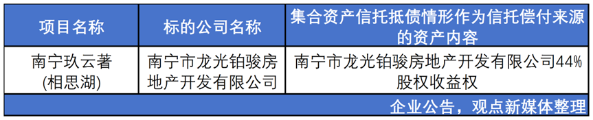 其三,确认集合资产信托偿付来源。在资产抵债选项下集合资产信托模式的前提条件满足并成功设立的情况下,龙光控股确认将“南宁玖云著(相思湖)”项目对应的南宁市龙光铂骏房地产开发有限公司44%股权收益权,作为集合资产信托抵债模式下的偿付来源。