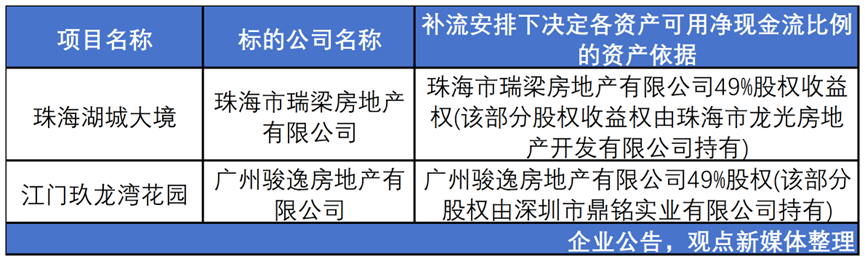 其二,确认部分项目为补流资产。龙光控股确认将“珠海湖城大境”(珠海市瑞梁房地产有限公司49%股权收益权)及“江门玖龙湾花园”(广州骏逸房地产有限公司49%股权)纳入补流资产范围。