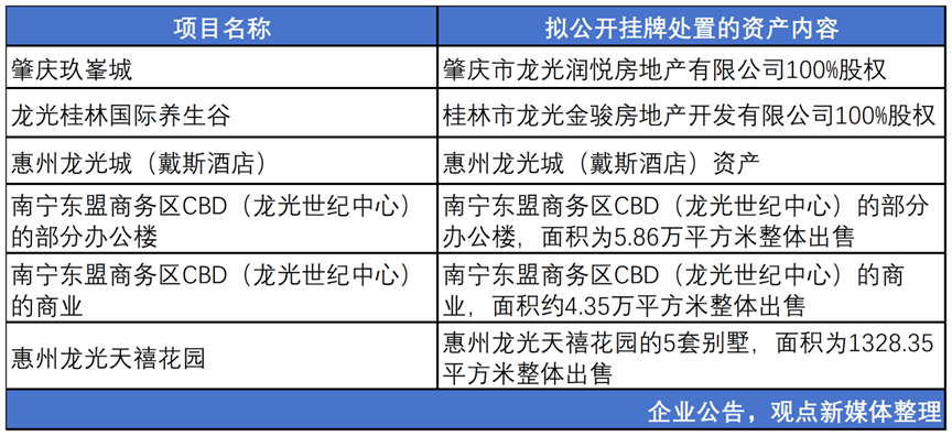 其一,拟公开挂牌处置部分资产。公告显示,该公司计划将包括“肇庆玖峯城”项目公司100%股权、“龙光桂林国际养生谷”项目公司100%股权、“惠州龙光城(戴斯酒店)”资产、南宁龙光世纪中心部分办公楼及商业物业、以及惠州龙光天禧花园5套别墅在内的多项资产纳入挂牌范围。