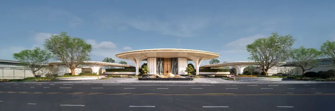该项目的大门,同样被升华成艺术般的入场仪式。大门以约12米的挑高和约11米的出檐,加上两边景墙总宽约128米的恢弘宽度,构建出强烈的视觉殿堂感。