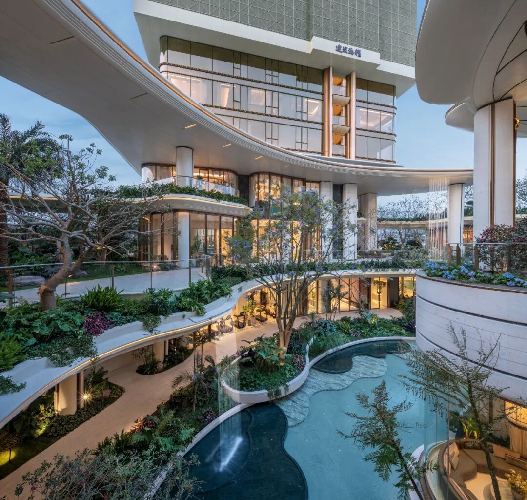 核心景观以《山海经》中的“建木神树”为灵感,搭配芙蓉花瀑与象征聚宝的池景,地面铺装也暗藏锦绣芙蓉纹样。