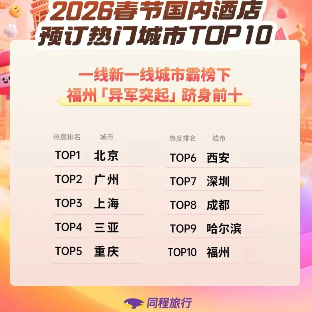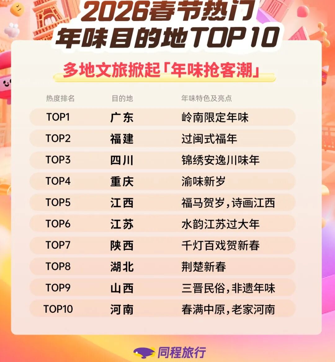同程旅行《2026年春节旅行趋势报告》显示,广东、福建、四川等多地掀起“年味抢客潮”,南下避寒则带动了云南、海南,酒店预定也热度高涨。
