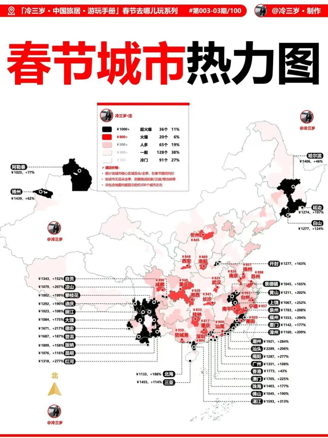 博主“冷三岁”通过统计全国约300城核心区亚朵/全季春节期间均价(无则替换为如家/汉庭/维也纳),制作的【春节城市热力图】显示: