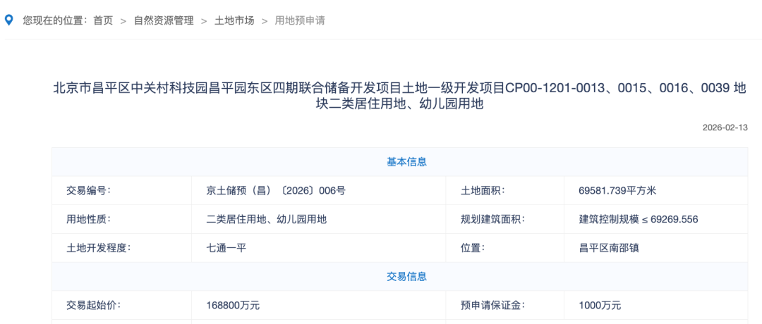 今天,昌平南邵地块也进入了预申请流程,起始价16.88亿元,受理时间截至3月16日下午17:00。