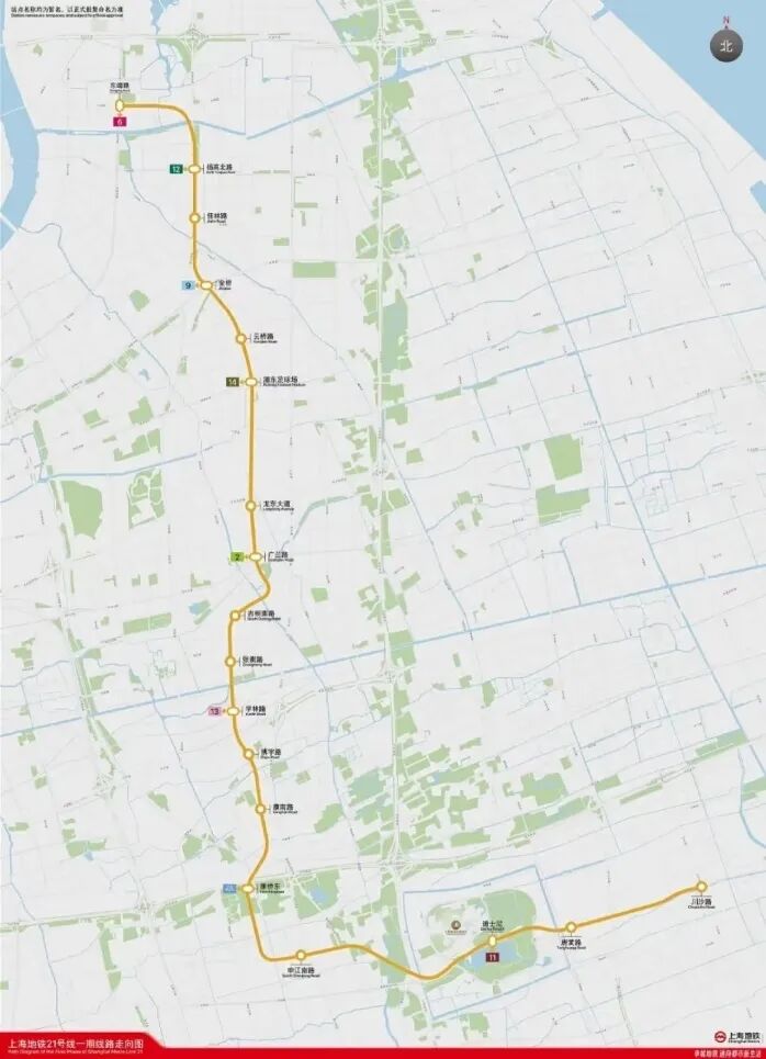 21号线一期工程线路北起浦东高行的东靖路站,南至上海国际旅游度假区东侧的川沙路站,全长约27.964公里,全部采用地下敷设方式,共设18座车站。目前一期工程正线的盾构已全部完成,部分车站主体结构已封顶,正在进行铺轨施工及附属结构施工。