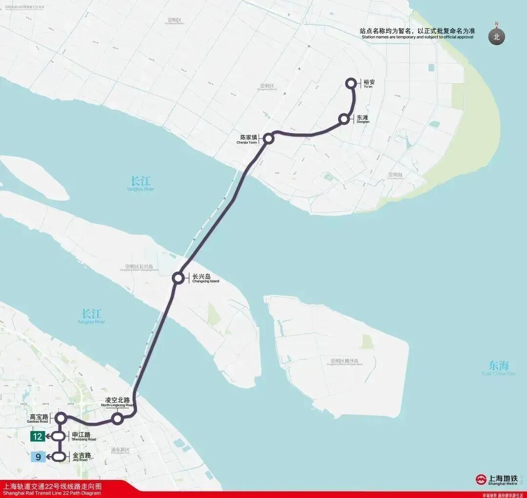 上海地铁22号线(崇明线)是连接崇明岛与上海主城区的首条轨道交通线路,全长约42.232公里,设8座地下车站,起自浦东新区金吉路站(可换乘9号线),终至崇明岛裕安站。途经浦东金桥、长兴岛、陈家镇等地。线路采用南港、北港双隧道穿越长江,是国内最长距离穿越长江的轨道交通工程。