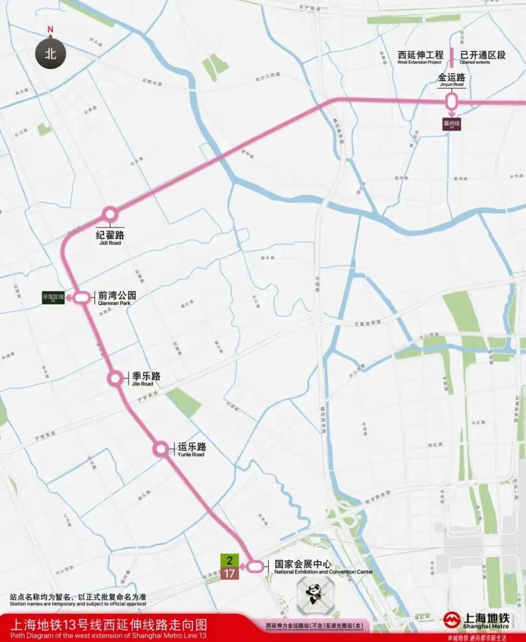 13号线西延伸段全长约9.6公里,新增纪翟路站、前滩公园站、季乐路站、运乐路站、国家会展中心站5座地下车站。12月19日已实现主体结构贯通,目前已经进入铺轨阶段。
