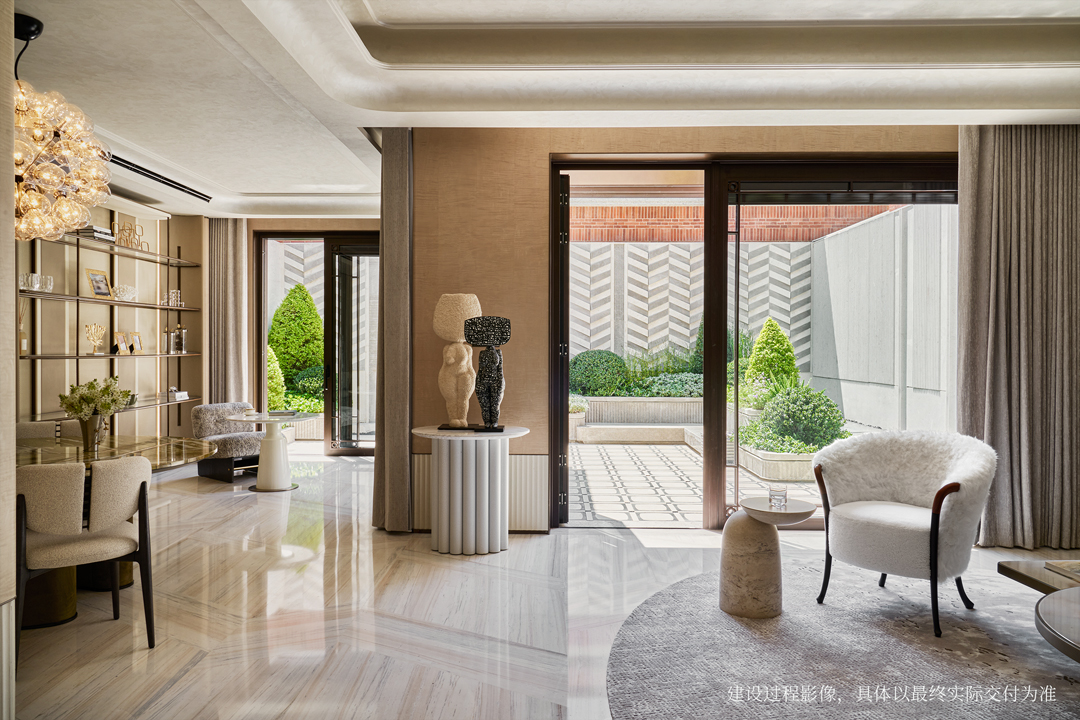 德康里的独特价值,更源于其毗邻地块内规模最为宏大的法国尚美花园。设计承袭法式古典园林的秩序礼序,并非简单复刻,而是以当代审美为纽带,将海派摩登意蕴与法式优雅庄重深度交融,创造出“上海未曾见的风貌庄园新体验”。